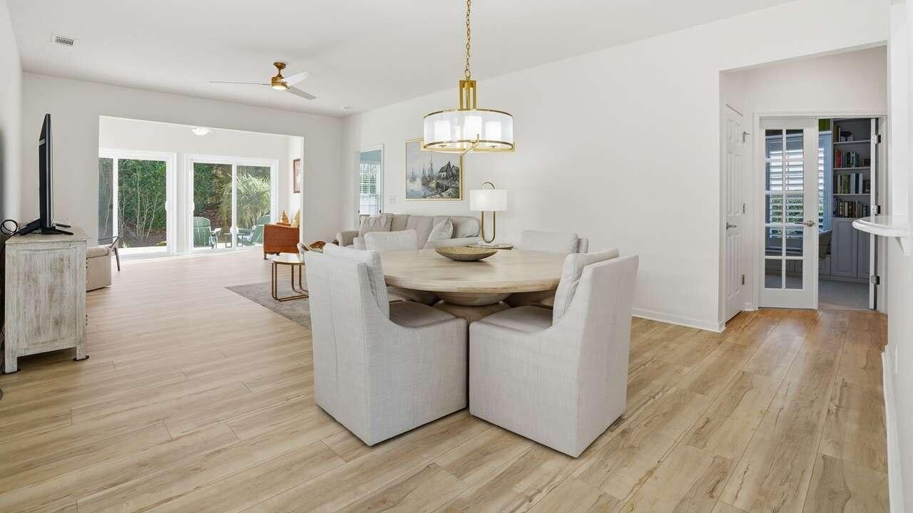 Peace & Privacy in Del Webb Cane Bay -- Over 50,000 in Upgrades in the Past Two Years AloneThis 55+ home in Del Webb at Cane Bay offers a secluded setting with a private wooded backyard and no rear neighbors. Located on one of the farthest streets from Cane Bay Blvd., it delivers peace and quiet in a low-maintenance community.1,510 sq. ft. 2 bed, 2 bath + flex room - Extensively updated and move-in ready, the major work is already done -- giving you a true turn-key opportunity.Notable Upgrades: Fully remodeled kitchen (2024) Remodeled bathrooms (2025) with modern dual-flush one-piece toilets New roof shingles (2024) New flooring throughout main living areas, kitchen, sunroom, and bathrooms (2024-2025) Custom Norman plantation shutters plus custom blinds (2024) Added pantry cabinet with custom soft-close doors (2023) Custom built-in library shelving (2022) Water heater (2021) Microwave and oven with air fryer (2025)Note: Refrigerator and washing machine do not convey.The flex room features double French doors, custom built-in shelving, and a closet -- perfect for a home office, library, or guest space.Combining thoughtful recent upgrades, excellent privacy, and resort-style 55+ living, this home is an excellent turn-key option that's currently available in Del Webb Cane Bay.